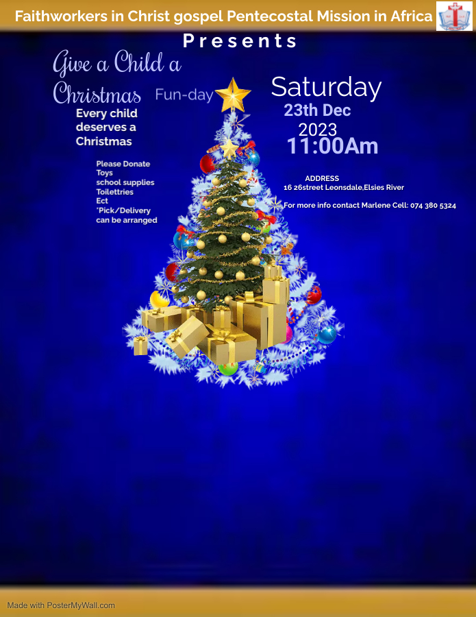 Give a Child a Christmas is a project we started this year to allow all children to feel the love and joy of Christmas. Our Sunday school will be hosting a Christmas Fun- day for the children of the nearby communities. Were the children will play games for free and win prices, clothing, shoes, toys, sweets ect. We will also be having a Christmas lunch for all attending. We will only be able to do this with all your support. Thank you in advance for your donations.